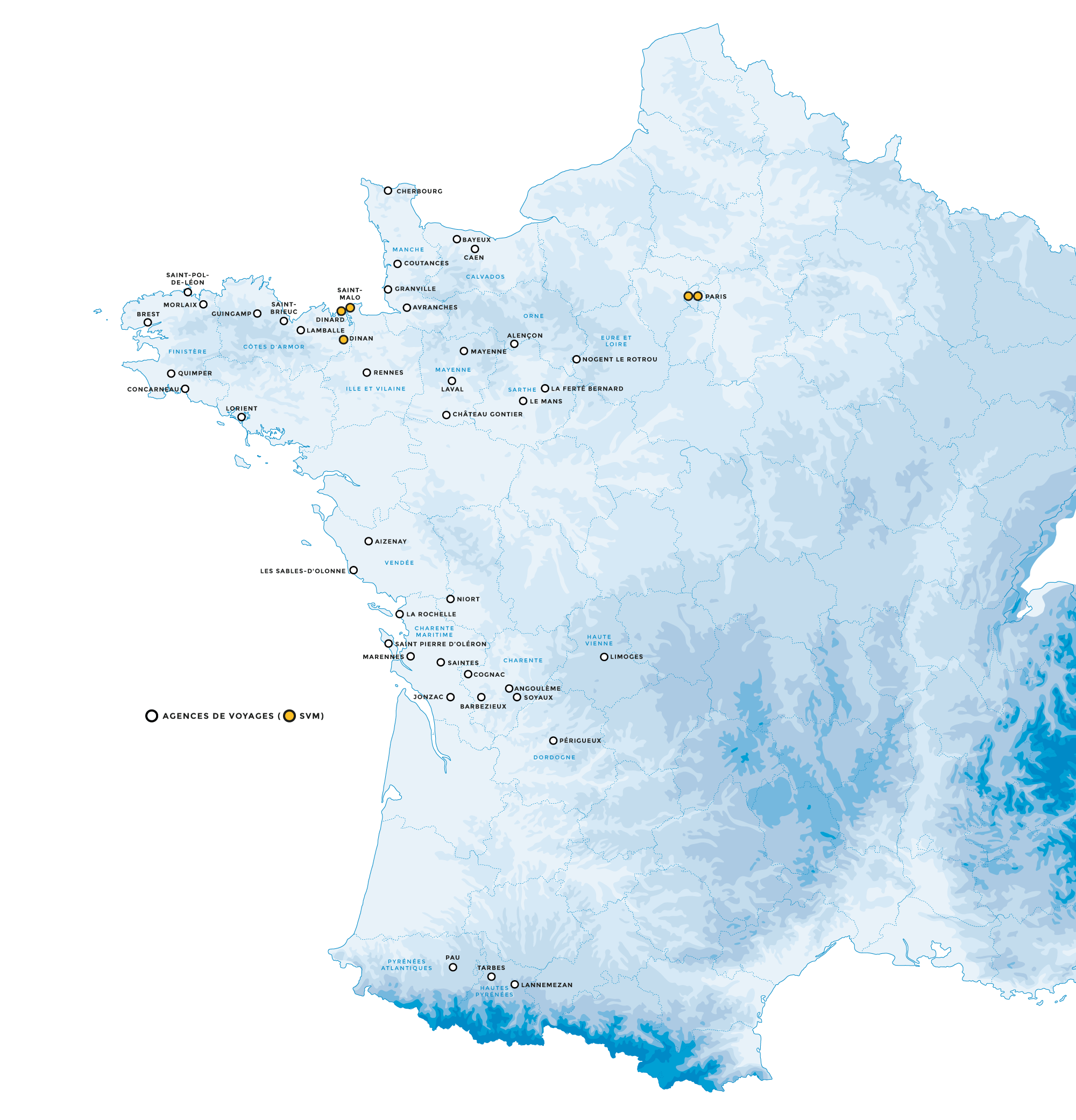 le Groupe Le Vacon De Maillard avec ses 5 implantations : Paris (SST Voyages et Parnasud Voyages), Dinan et Dinard (Khaolan Voyages) et Saint- Malo (Voyages Morvan).